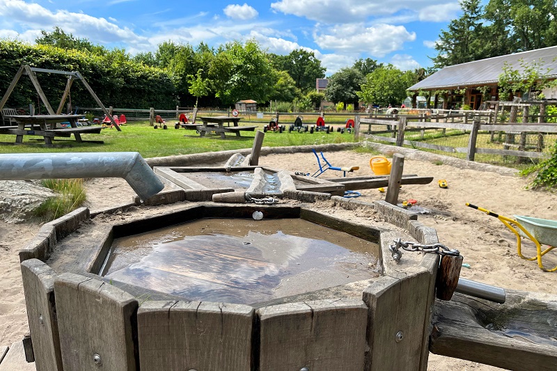 Spelen in de speeltuin met fantasie prikkelende waterspeelplaats, goed voor uren speelplezier voor jong en oud, en een fijne nestschommel.